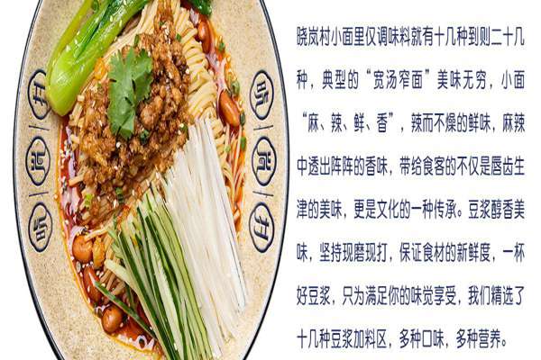 晓岚村小面里仅调味料就有十几种到则二十几种,典型的“宽汤窄面”美味无穷,小面“麻、辣、鲜、香”,辣而不燥的鲜味,麻辣中透出阵阵的香味,带给食客的不仅是唇齿生津的美味,更是文化的一种传承。豆浆醇香美味,坚持现磨现打,保证食材的新鲜度,一杯好豆浆,只为满足你的味觉享受,我们精选了十几种豆浆加料区,多种口味,多种营养。